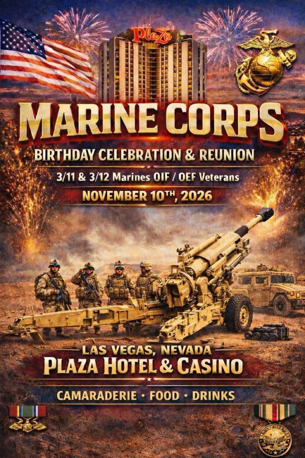 Join us in Las Vegas on November 10th, 2026 for the 3/11 & 3/12 OIF/OEF Reunion—a powerful gathering of Marines who served, sacrificed, and built lifelong bonds. Held on the Marine Corps Birthday, this event brings brothers back together to reconnect, share stories, and honor the legacy of those deployments. From meaningful traditions and guest speakers to great food, entertainment, and camaraderie, this reunion is more than an event—it’s a chance to relive the brotherhood and celebrate what it truly means to be part of the few and the proud.