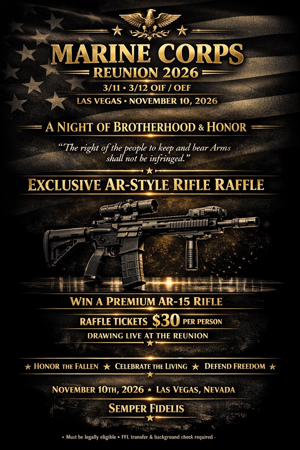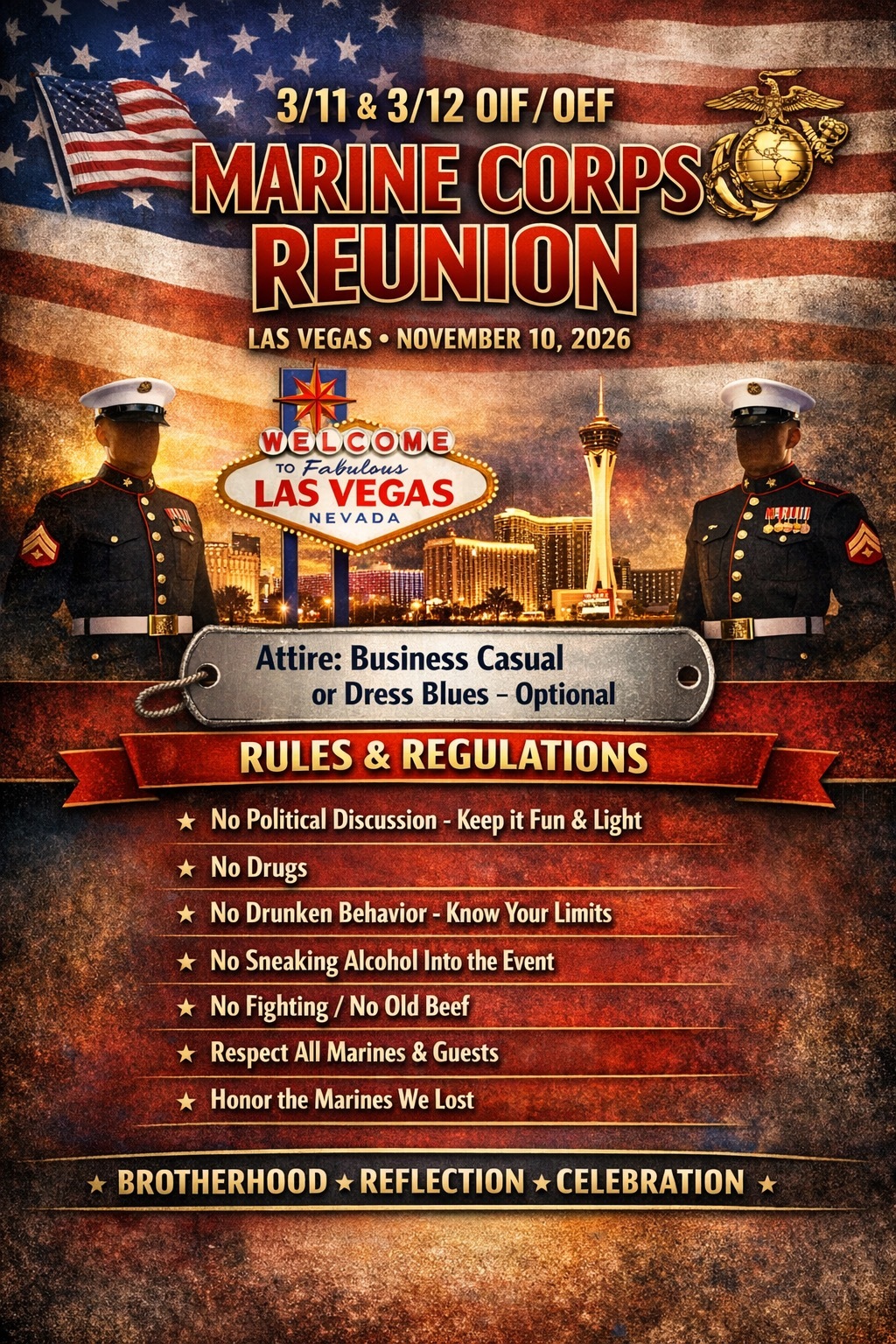 Join us in Las Vegas on November 10th, 2026 for the 3/11 & 3/12 OIF/OEF Reunion—a powerful gathering of Marines who served, sacrificed, and built lifelong bonds. Held on the Marine Corps Birthday, this event brings brothers back together to reconnect, share stories, and honor the legacy of those deployments. From meaningful traditions and guest speakers to great food, entertainment, and camaraderie, this reunion is more than an event—it’s a chance to relive the brotherhood and celebrate what it truly means to be part of the few and the proud.